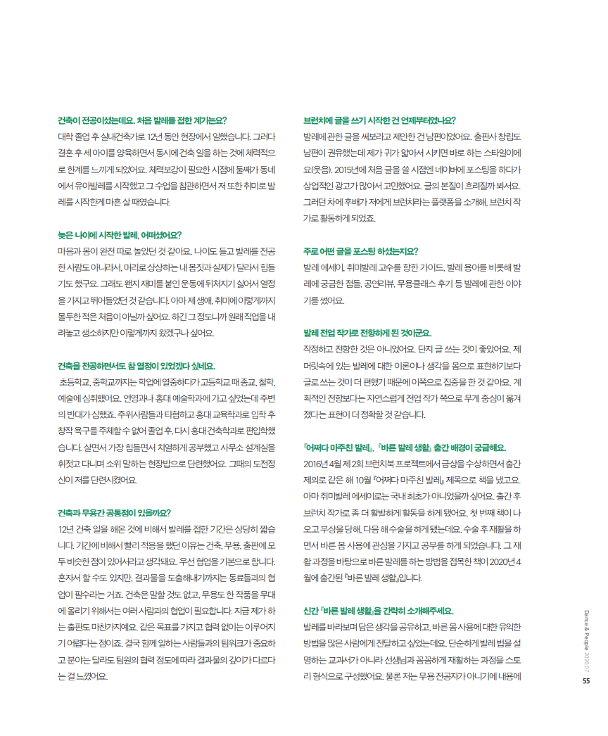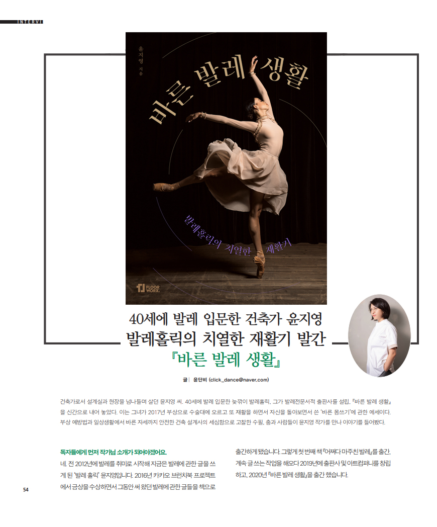 40세에 발레 입문한 건축가의 치열한 재활기 발간 『바른 발레 생활』 | [춤과 사람들] 인터뷰 2020년 7월호 여전히 건축 잡지가 아닌 무용 잡지에 기사나 인터뷰가 실릴 때마다 깜짝깜짝 놀라지만