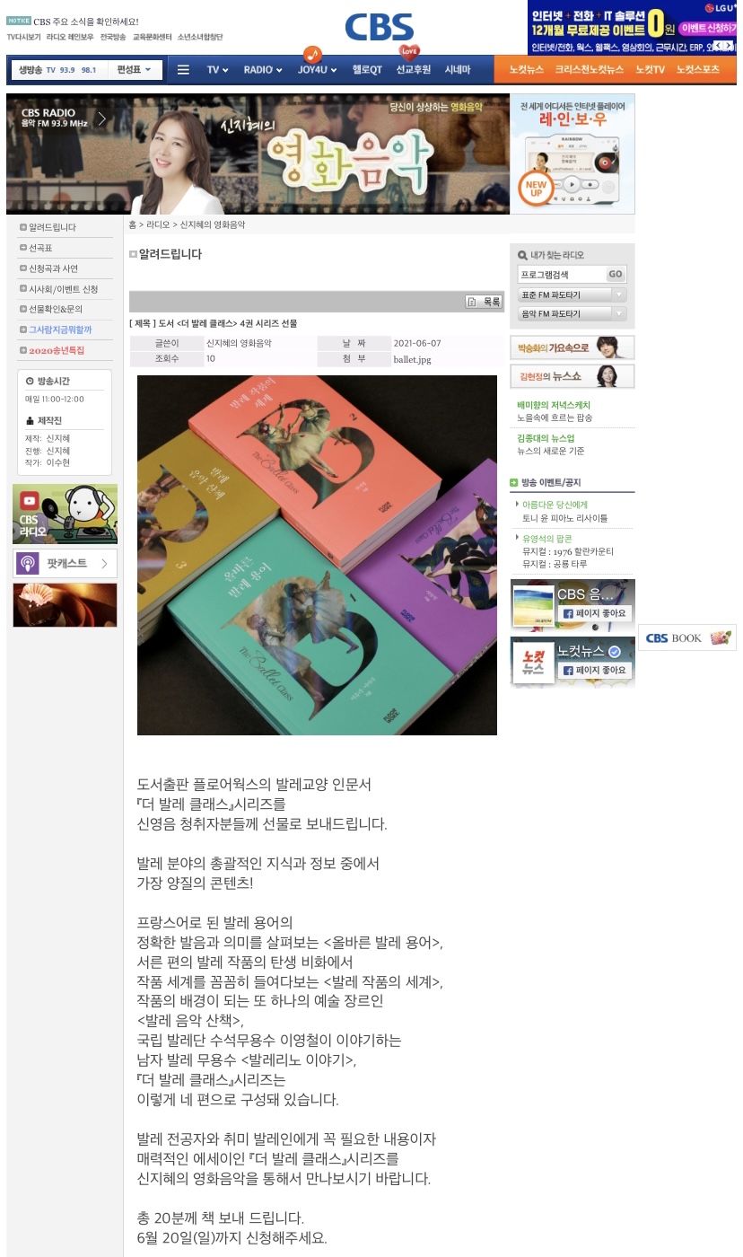 <CBS 신지혜의 영화음악> 이벤트 코너에서 [더 발레 클래스] 도서를 선물로 드립니다.